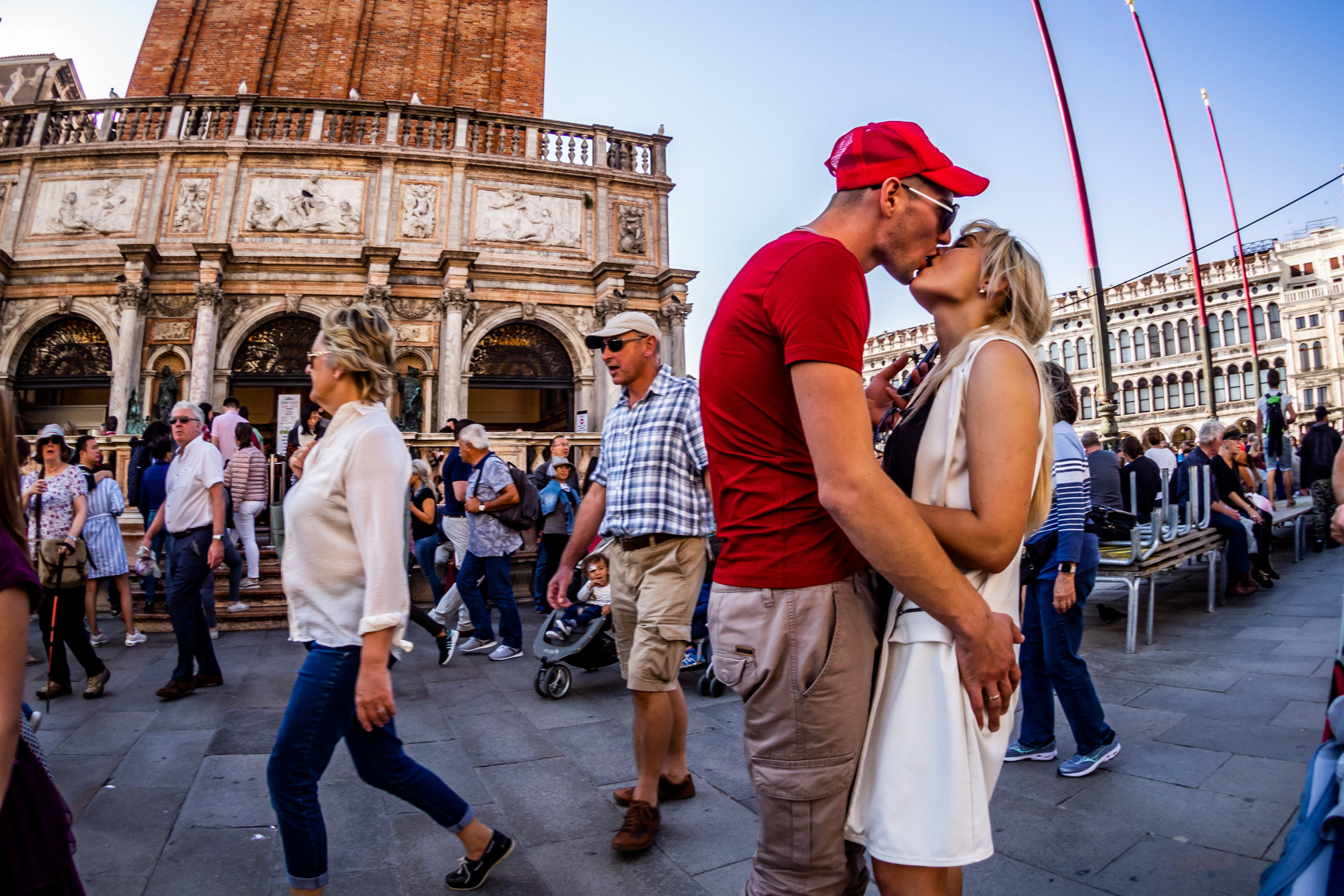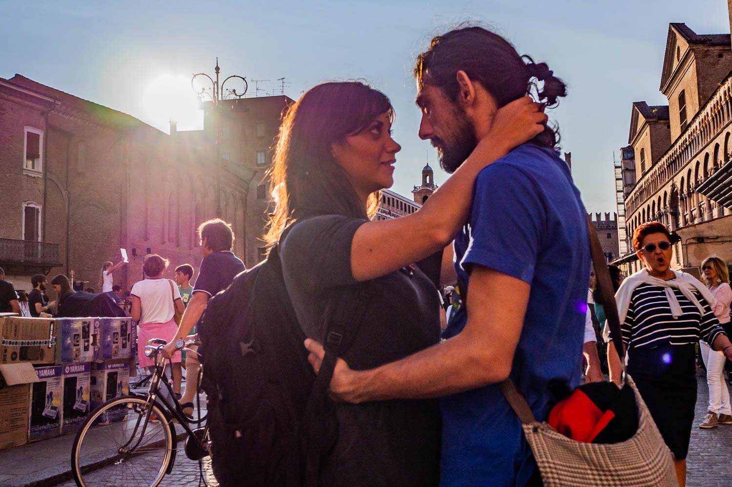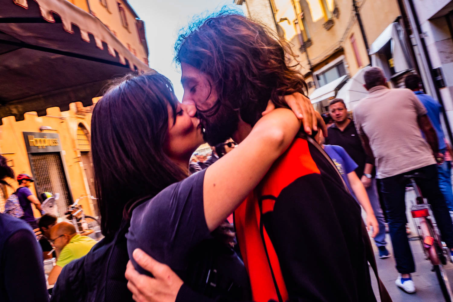 Baci che scivolano tra riflessi e traffico. Una carezza prima del verde, una coccola dietro una vetrina. L’amore, in città, non chiede permesso.